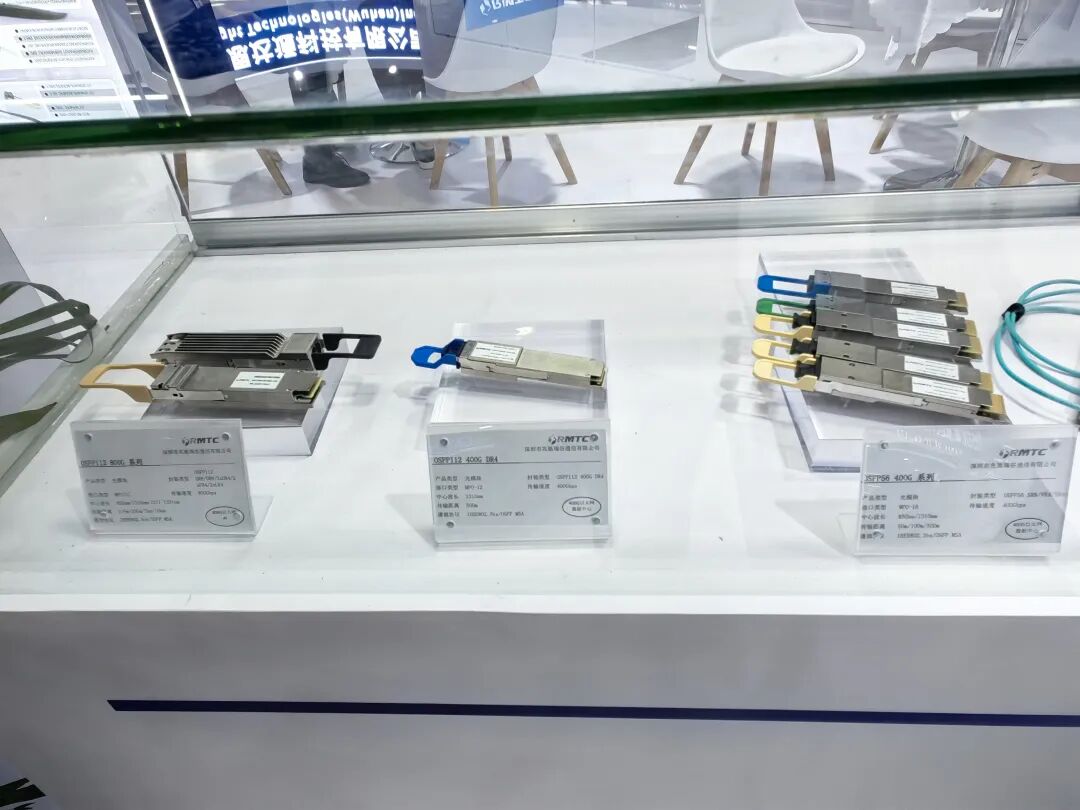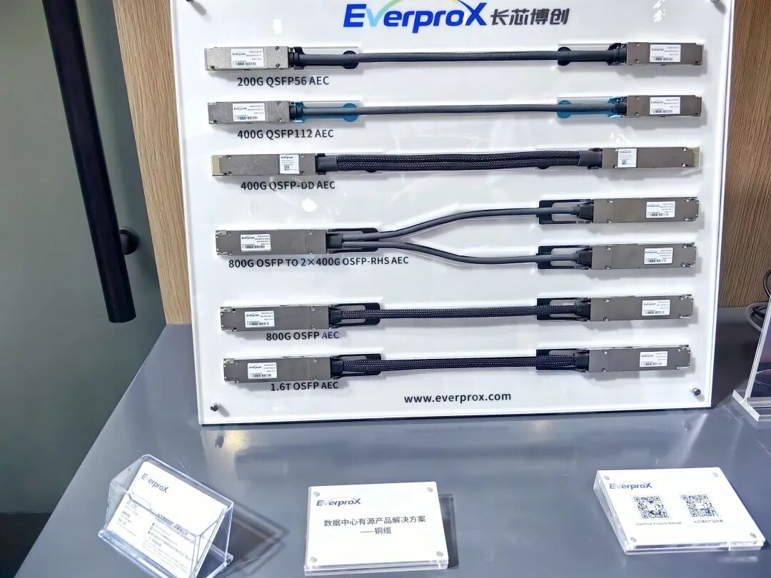 长芯博创展示了光模块和相关铜缆产品。据介绍,1.6T光模块通常采用光缆,但是铜缆方案比光缆方案成本低一半以上,仍然占据很重要的市场。