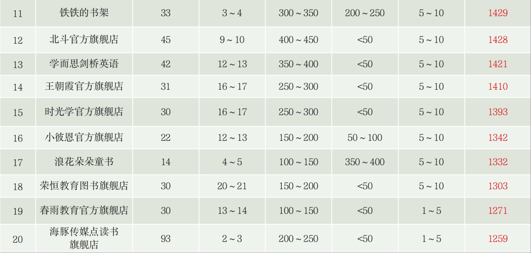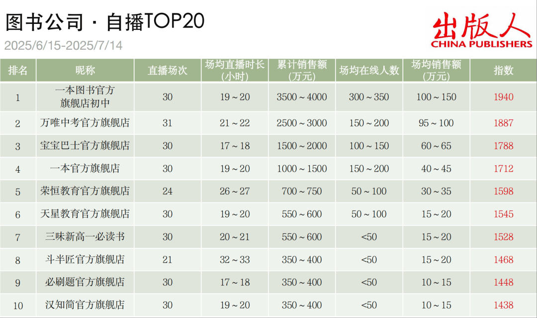 20强指数门槛为1259。在统计周期内,20强账号共计带货直播656场,累计销售额均过百万元,20强账号累计销售总额超1.5亿元。“宝宝巴士官方旗舰店”“三味新高一必读书”“王朝霞官方旗舰店”“小彼恩官方旗舰店”本期进入图书公司自播20强。本期图书公司自播20