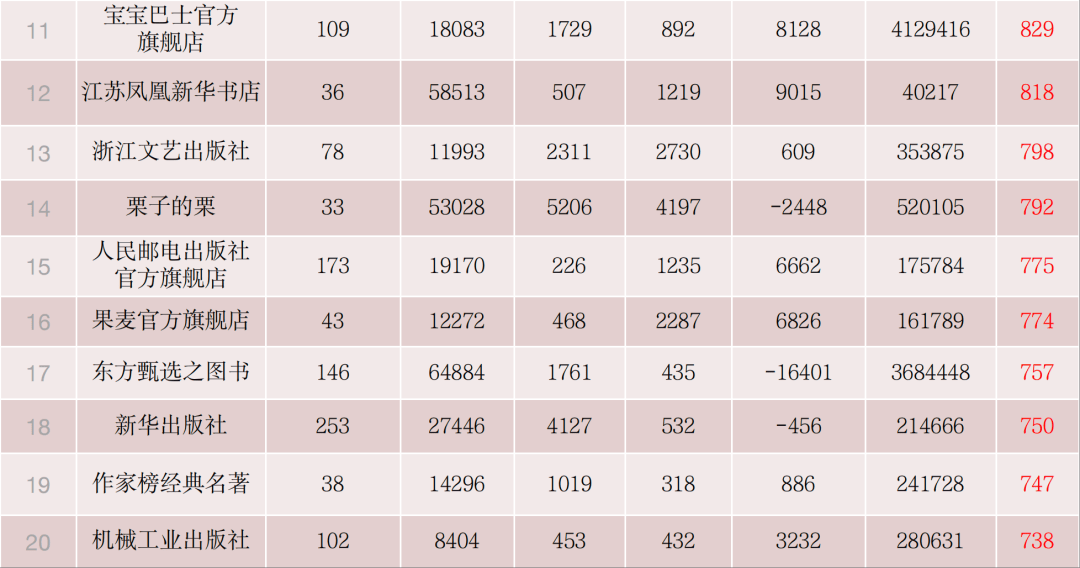 “天天出版社童书优选”从上期出版、发行机构的第245位升至本期第96位,上升149个位次;“党史出版社”从上期第256位升至本期第136位,上升120个位次;“北京科学技术出版社”由上期第191位升至本期第116位,上升75个位次。图书公司自播: