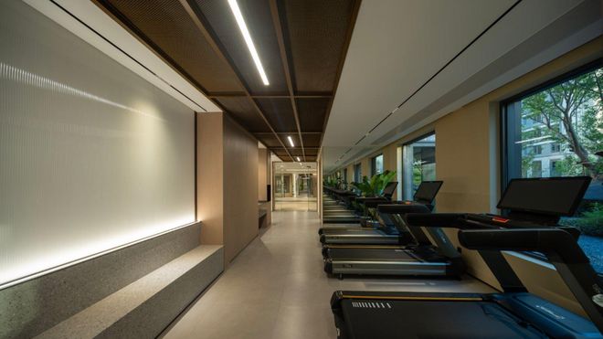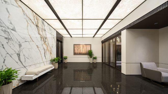 单元入户空间也显得尤其敞亮,打造双层挑高入户大堂,电梯内亦使用BV风编织皮革饰面装饰,将归家仪式感贯彻到家门口。