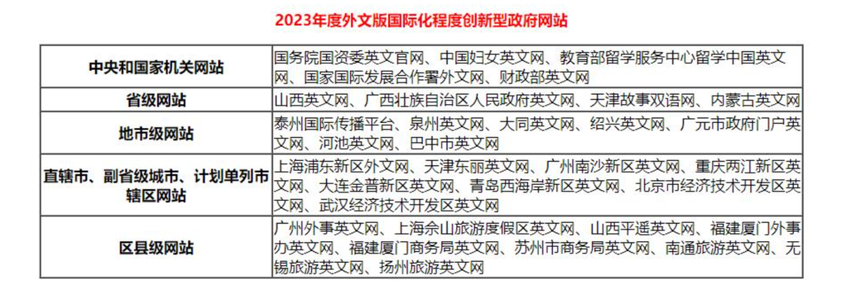 中国信息化研究与促进网联合国衡智慧移动大数据联盟、太昊国际智库在中央权威媒体支持下连续12年组织开展全国外文版政府网站评估工作。今年的评估依据《2023年度中国政府网站外文版国际化程度评估指标》,通过软件测评、单位自荐、专家评审和综合评估等多个环节对我国外文版政府网站建设情况进行了综合分析和研究。现将评估成果予以公布: