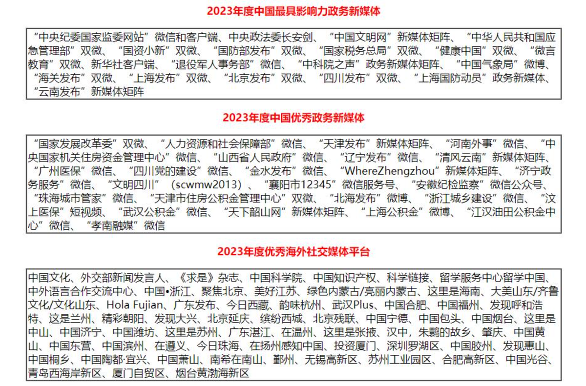 2023年中国最具影响力政务新媒体评估依据《政府网站与政务新媒体检查指标、监管工作年度考核指标的通知》《关于进一步做好政务新媒体工作的通知》等关于政务新媒体的文件要求,评估组拟定了《2023年中国政务新媒体评估指标》《2023年度综合类外文海外社交媒体账号评估指标》,通过对全国党务政务新媒体数据的采集,从五大纬度十四个二类指标开展分析测评,采用大数据采集、抽样调查、单位自荐、专家推荐、综合测评等多种手段,推荐评估出以下最具影响力政务新媒体和优秀政务新媒体等领先成果。